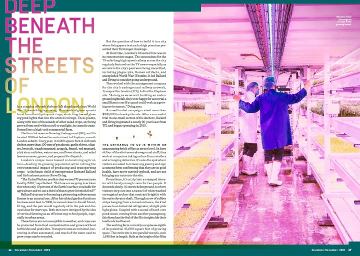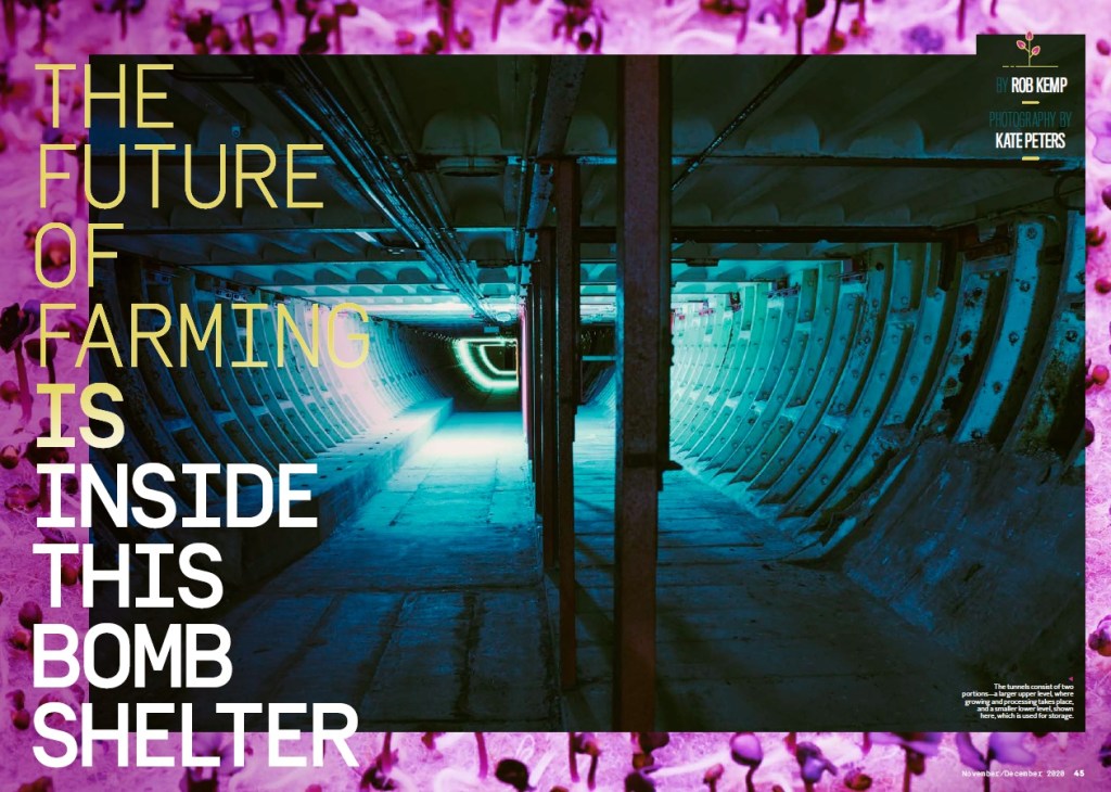Thirty three metres beneath London lies a complex of abandoned tube tunnels stretching from Clapham in the south to Belsize Park in the north. Built in the 1940s as part of an aborted Northern Line ‘Express Way’ they sheltered 8000 Londoners during The Blitz before being left to decay for over half a century. Now one section of tunnels has been brought back to life as Growing Underground – a futuristic farm growing tonnes of crops for the capital’s markets, shops and restaurants. The food needs no soil or pesticides, it requires just recycled water, LED lights and a fraction of the space conventional farms use. My report on this future of farming is out now in the latest issue of Popular Mechanics